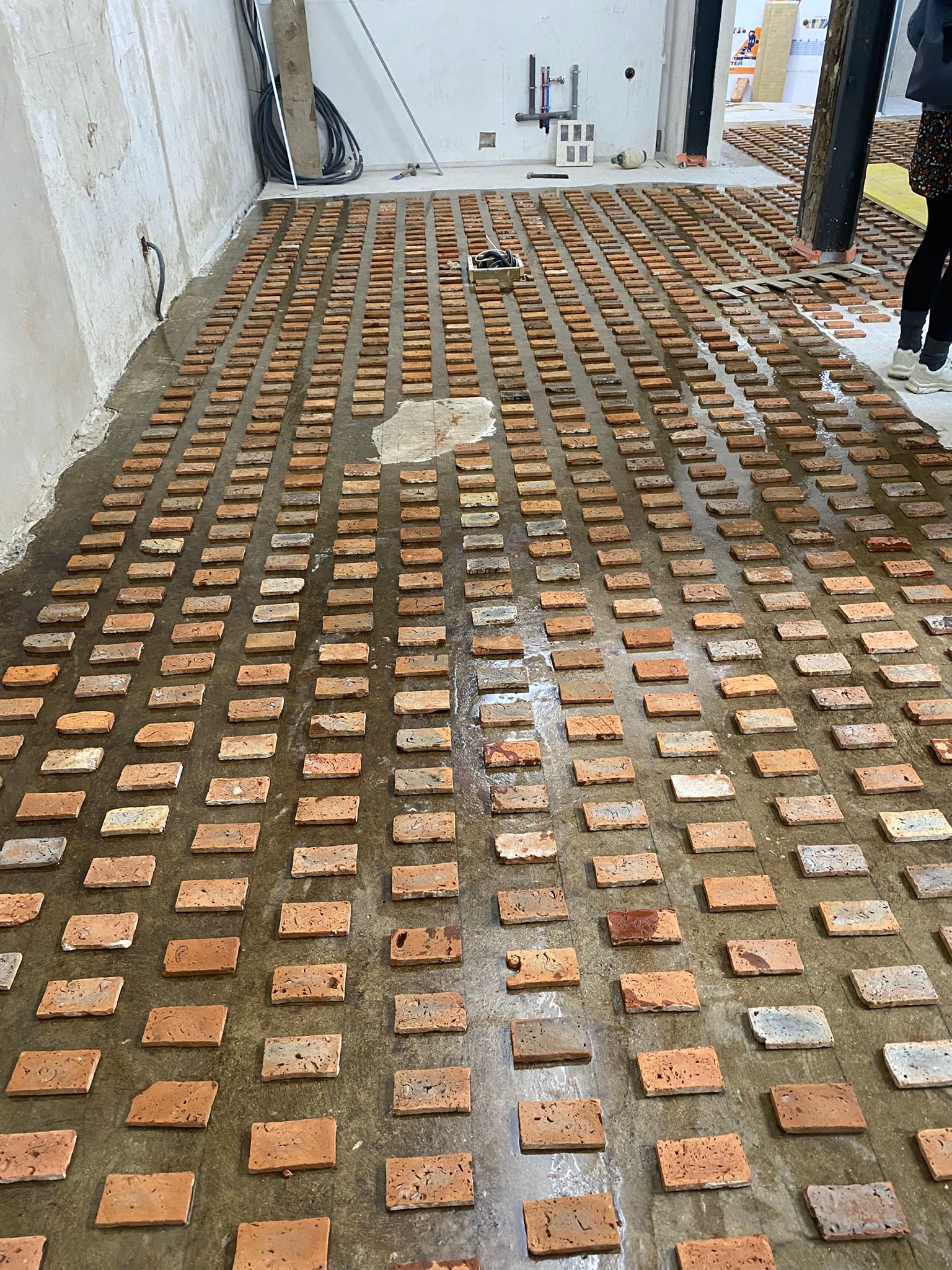 Chaque pièce est nettoyée, découpée et reconditionnée pour s’intégrer harmonieusement dans un nouveau sol ou un nouveau mur, prolongeant ainsi son histoire.